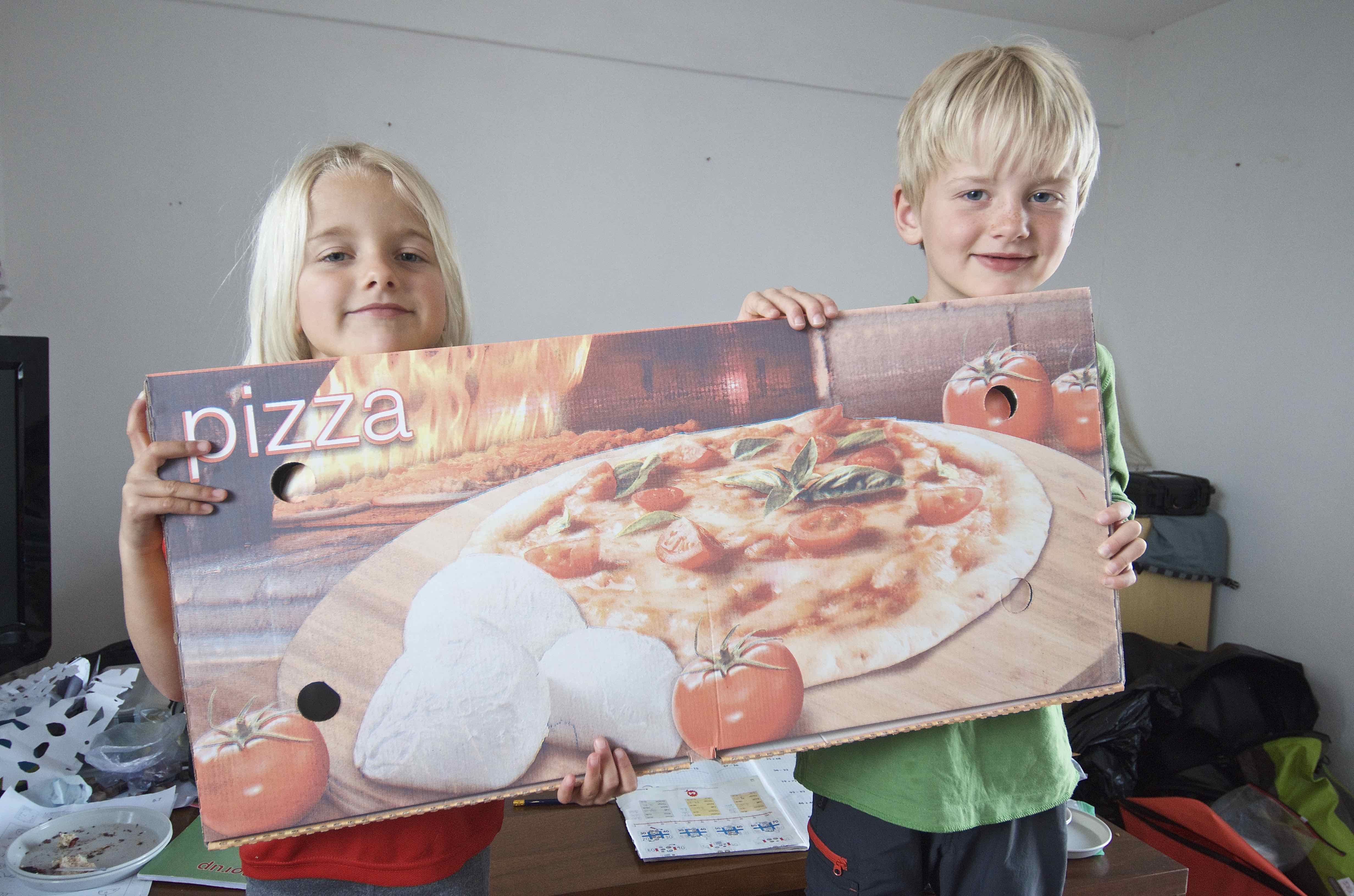 One evening a guy from the sailing club came by with his kids and gave us one of the biggest boxes of Pizza we have ever seen / En aften kom en af gutterne fra sejlklubben forbi sammen med hans sønner og have pizza med i en af de største pizza kasser vi har set / Een avond kwam iemand van de zeilclub langs, met zijn zonen, en gaf ons Pizza. In de grootste doos die wij ooit zagen (je raadt al wat we aten voor ontbijt)!
