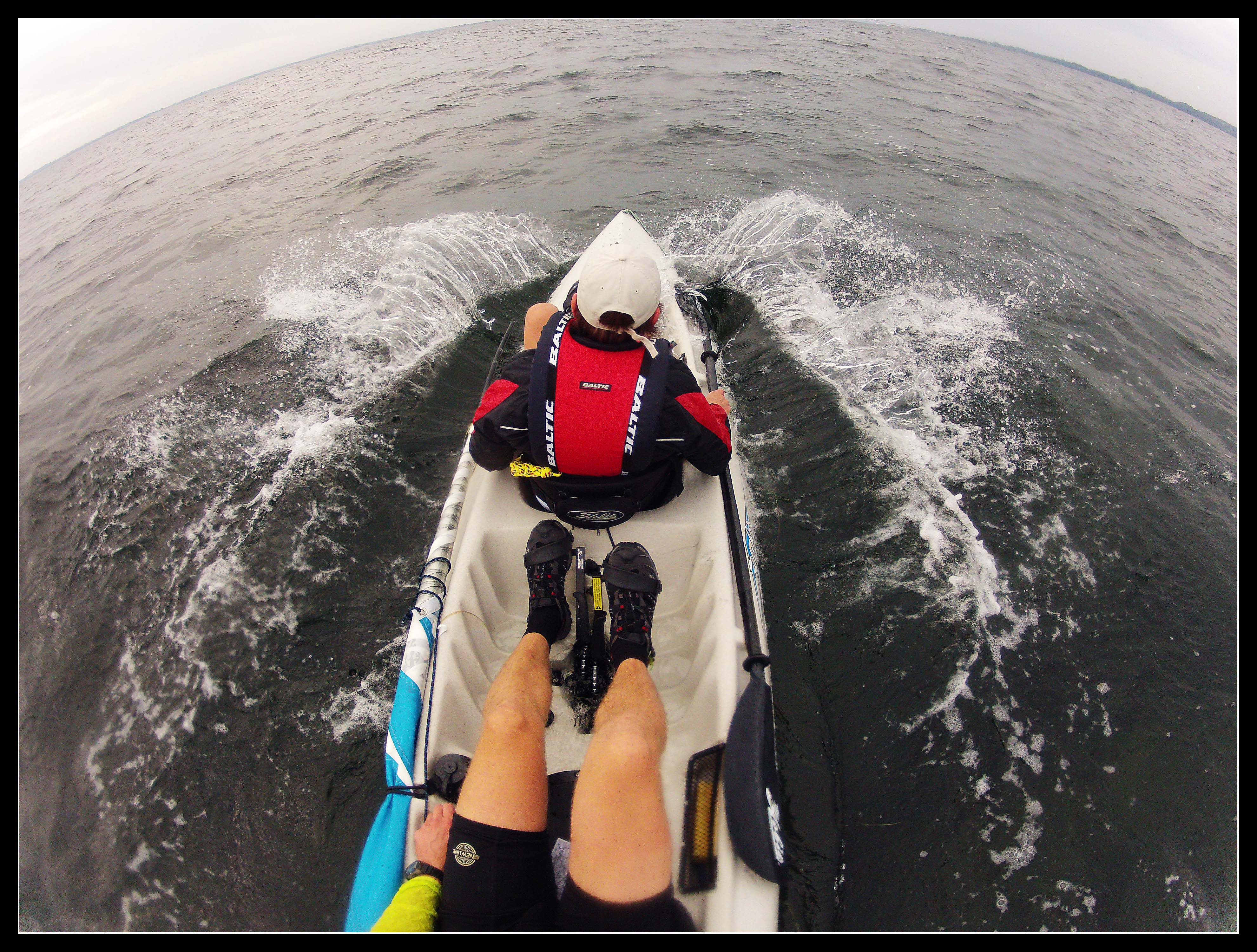 Started from Marie Grubbes road, close to the dam from Bogø at 10.30 am and arrived at Mandemarke Haver 6.30 hours later at 5 pm. It was a good day, with lots of sunshine. We started with 8-9 ms wind, that turned into tailwinds after 7 km, with waves around 1 meter. It was fun to ride the waves, and looking over the shoulder not being able to see over the next wave. But my mum got seasick. With help from the sail, our average speed was around 6, 5 km an hour. The first time we went ashore, we almost went over in the surf, but learn our lesson and didn’t have any problems after that. After our second break, where we had a powernap, the wind dropped to 3-5 ms and the last 9 km was nice and easy. Tired, we arrived at Mandemarke Haver shelters only 15 m. from the water.